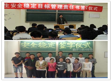 学院领导高度重视学院学生工作的发展,结合自身条件和特点,通过领导班子集体研究论证,制定《数学与统计学院关于创建安全稳定保障建设特色基地的实施方案》。2010年4月,学生工作部组织专家评审确定了10个学生工作精细化管理特色基地创建单位。经过一年的创建,于2011年4月进行了专家评审组的严格评审,数学与统计学院最终获得“安全稳定保障建设特色基地”命名授牌。